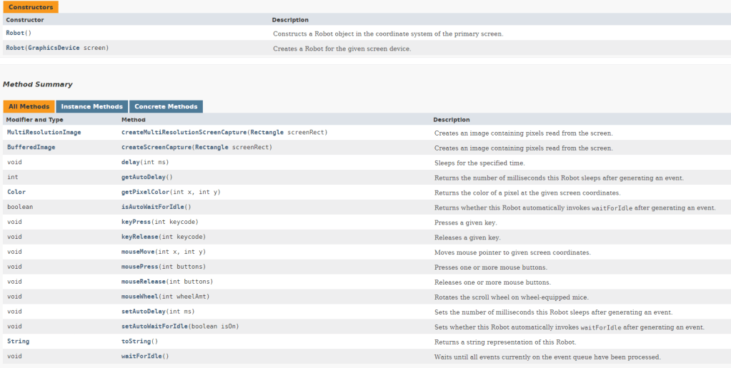 mouseMove()are dependent on screen resolution so the method may perform differently on different screens. - This class acts only on the window in focus so the behavior may differ when multiple windows open. For example if you are write code for robot class event and during execution if user moves in other window then it will not work.